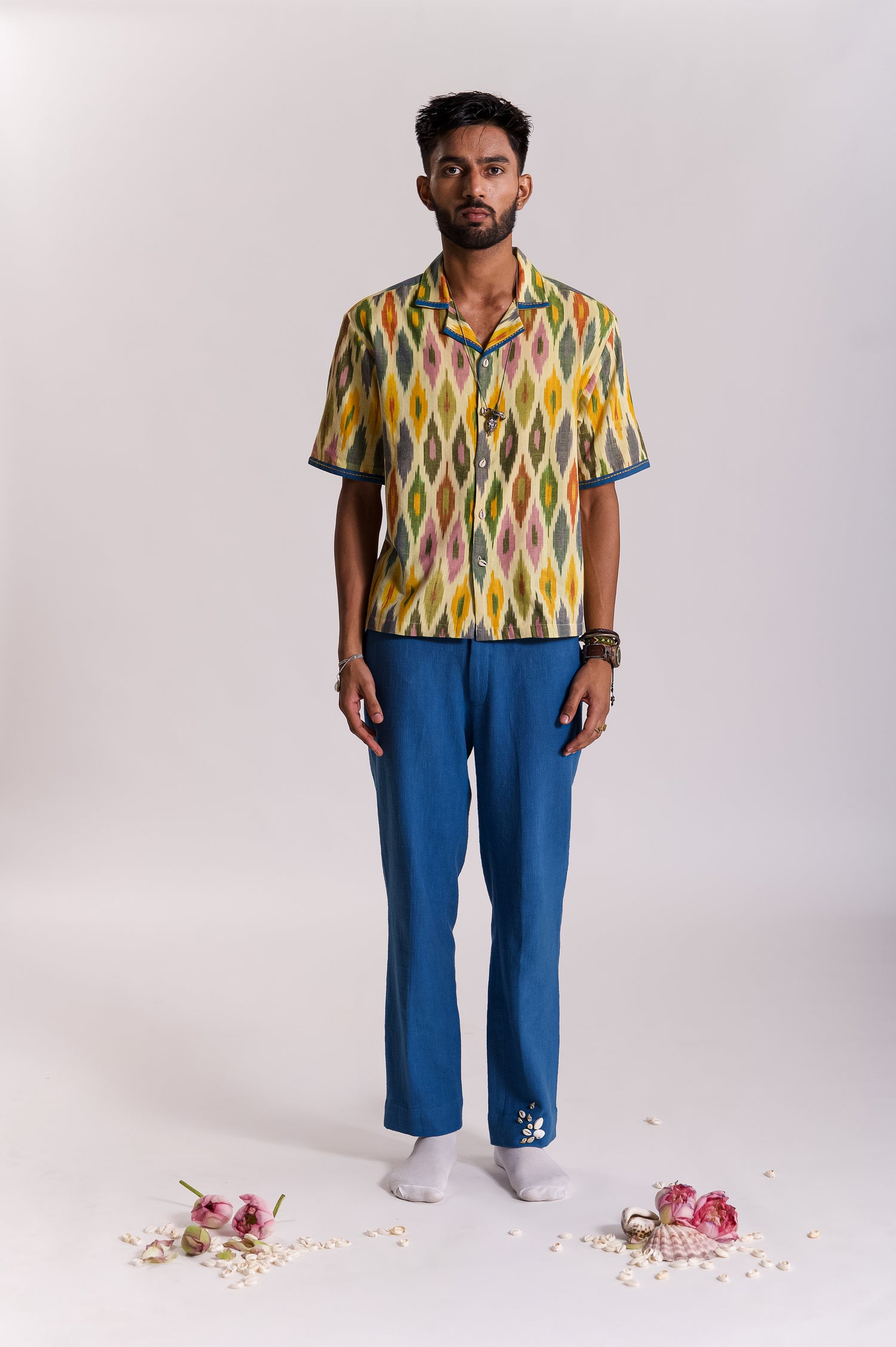 The Handwoven Ikat Shirt features contrast piping on the collar and sleeves, accentuated with delicate Kantha stitches. The ikat color palette draws inspiration from the sacred herbs cast into the ocean to begin the Samudra Manthan. Finished with kauri shell buttons, each detail adds meaning to form and function.
